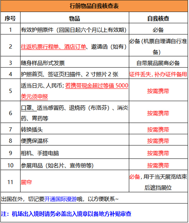 3.若自行攜帶樣品,請務必用行李箱裝運或折疊小推車,方便托運、過關,以及機場、展館的進出,并攜帶形式發票。