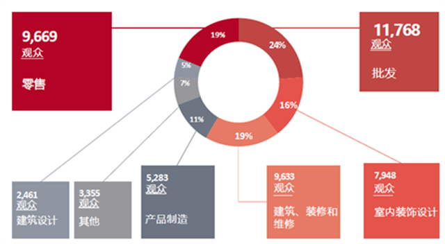 批發商和貿易公司代表占主導地位。批發商和貿易公司觀眾占比24%,他們是行業關鍵決策人和意見領袖。多元化行業精英云集。零售商、建筑師、設計師及裝修裝飾專業人員各占19%,為參展商提供了廣泛的業務發展機會。室內設計師占16%,他們對設計趨勢和新產品有著極高的關注度。建筑及裝飾材料制造商占11%,他們在尋找合作伙伴和新的產品方案。建筑設計師占5%,他們對新的設計理念興趣度很高。