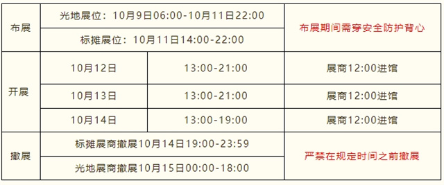 1、請于 2025年10月11日22:00 前完成展臺裝飾及展品布展,布展及撤展期間,展商進入展館時需穿高能見度的安全防護背心及不露趾的鞋。