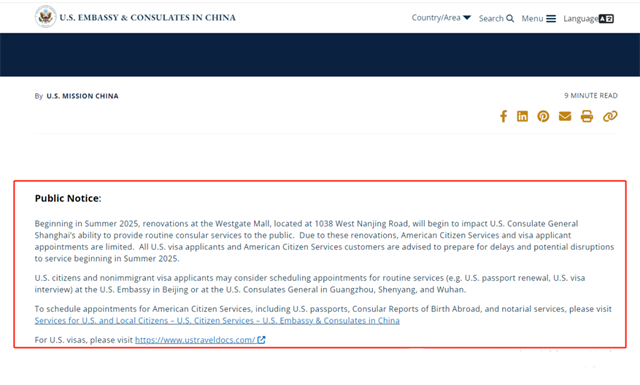 從 2025 年夏季開始,位于南京西路 1038 號的 Westgate 購物中心的翻修將開始影響美國駐上海總領事館向公眾提供常規領事服務的能力。由于這些翻修,美國公民服務和簽證申請人的預約受到限制。建議所有美國簽證申請人和美國公民服務客戶為 2025 年夏季開始的服務延誤和潛在中斷做好準備。